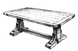 Стол прямоугольной формы изготовлен из сосновой древесины. Базируется на двух ножках, соединенных перекладиной.